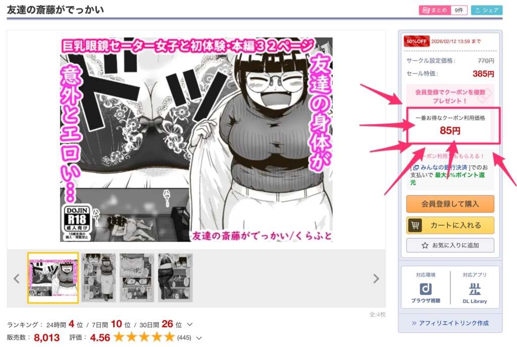 漫画「友達の斎藤がでっかい」は、DLsiteやFANZA同人で配布されるセールやクーポンをうまく利用すれば、実質無料で楽しむことが可能です。