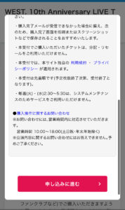 ①STARTO ENTERTAINMENTのサイト(チケットぴあ) から『WEST. DOME TOUR AWARD ~10th Anniversary~』を探す(コンサート名タップでサイトに移動できます)。